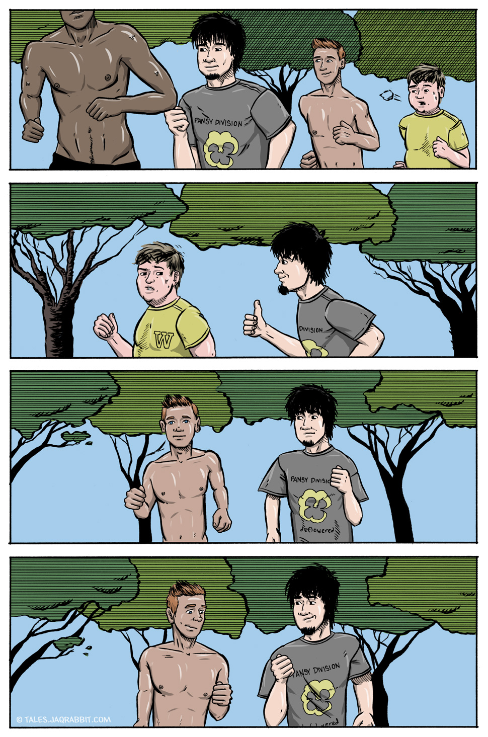 This is one of several Tales drawn by Rick Worley, whose series “A Waste of Time” told me that he would be an ideal artist to draw a gaggle of track-and-field boys, and that he had the storytelling chops to pull off a story without any dialog. I was never an athlete in school (team sports are toxic), but I liked jogging enough to keep up them when they were out for just a training run. But there comes a time when you find you… can’t keep it up.